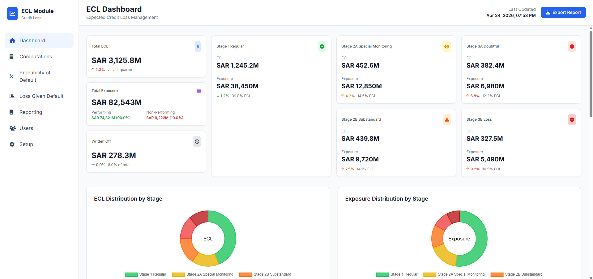 Total ECL, total exposure, performing vs non-performing breakdown, and written-off visibility in one control view.
